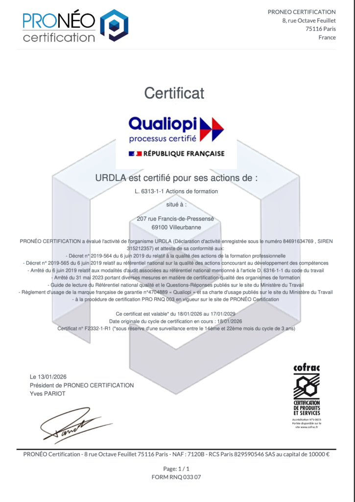 URDLA détient la certification qualité Qualiopi au titre de la catégorie d’actions suivantes : ACTIONS DE FORMATION.