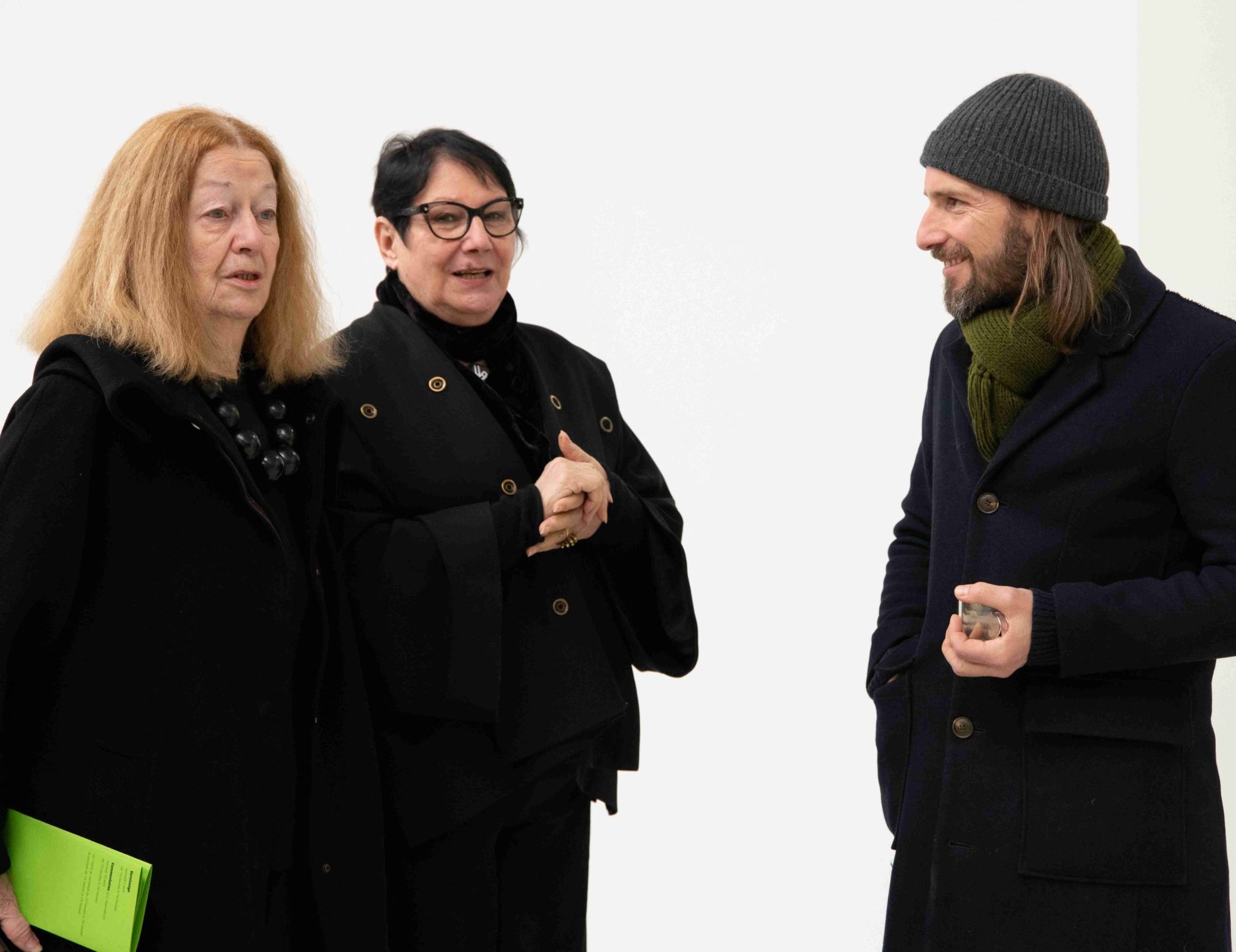 À gauche : Marie-Claude Schoendorff  au vernissage de l’exposition Karneval de Jean-Xavier Renaud à URDLA, 2022, Cécile Cayon©
