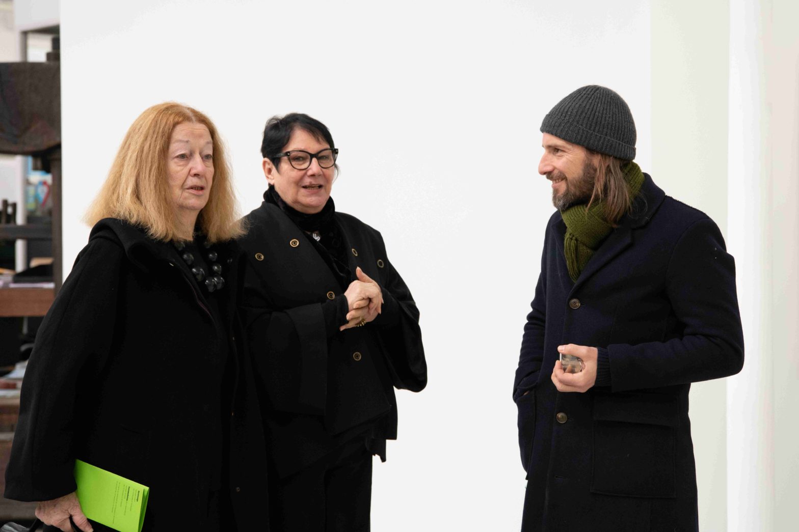 À gauche : Marie-Claude Schoendorff  au vernissage de l’exposition Karneval de Jean-Xavier Renaud à URDLA, 2022, Cécile Cayon©